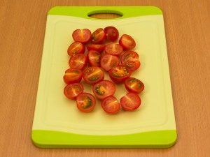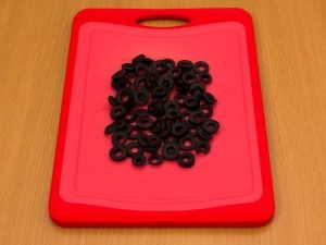 - Kirschhälften, Thunfischscheiben und Ringe darauf verteilen Oliven, mit Dressing bestreuen.