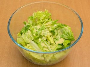 - Salat in einer Schüssel mit den Händen zerreißen, mit Sauce mischen.