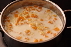 In einen mittelgroßen Würfel schneiden, in einen großen Topf geben und gießen Milch. Reis hineingeben.