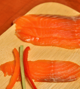 - Legen Sie einen Streifen roten und gelben Pfeffers und einen Streifen Gurke darauf eine Scheibe Fisch, alles mit einer Rolle rollen.