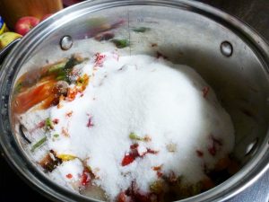 - Birnenzucker mit Gemüse und ein paar Minuten ziehen lassen Stunden. Birnen mit Gemüse beginnen Saft.