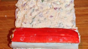 - Bereiten Sie die Füllung für die Krabbenstangen vor. Zander-Kaviar unterrühren Quark, fein gehackte Zwiebeln, Kräuter.