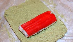 - Auf einen mit Frischhaltefolie bedeckten Tisch eine gefrorene Masse von Avocado, gekühlte Krabbenröllchen mit Füllung darauf.