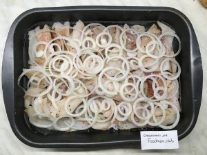 - Die Zwiebel in dünne Ringe schneiden und auf den Fisch legen.