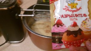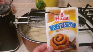 - Als nächstes fügen Sie Zimt und Backpulver hinzu, mischen Sie gründlich.