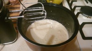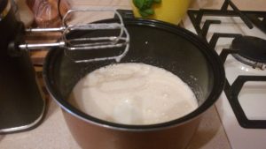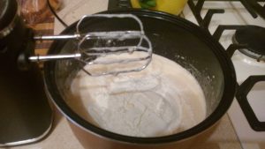 - 2 Tassen Mehl in den Teig geben, mit dem Mixer oder mit dem Schneebesen verquirlen mit einem löffel mischen.