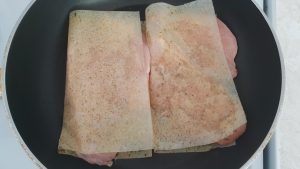- Wir legen das Filet auf eine Blatthälfte und bedecken die andere.
