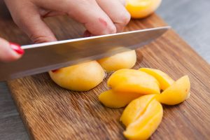 - Wir nehmen die Samen von den Aprikosen und schneiden das Fleisch in Stücke.